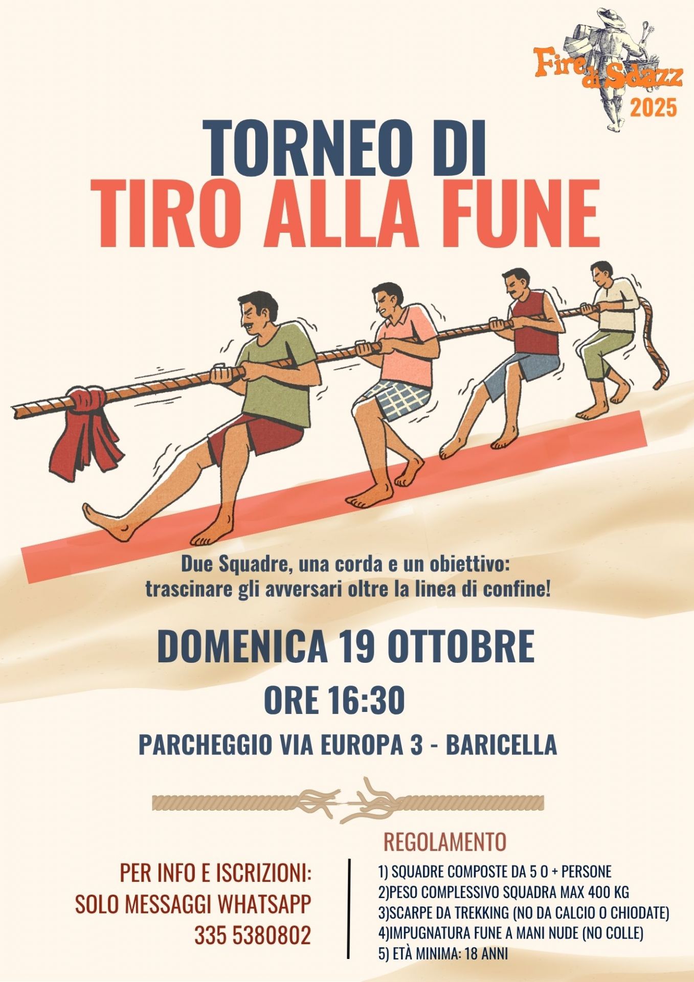 In occasione della Fire di Sdazz 2025, a Baricella si terrà un emozionante Torneo di Tiro alla Fune, dove le squadre si sfideranno in un clima di amicizia, divertimento e sano agonismo.