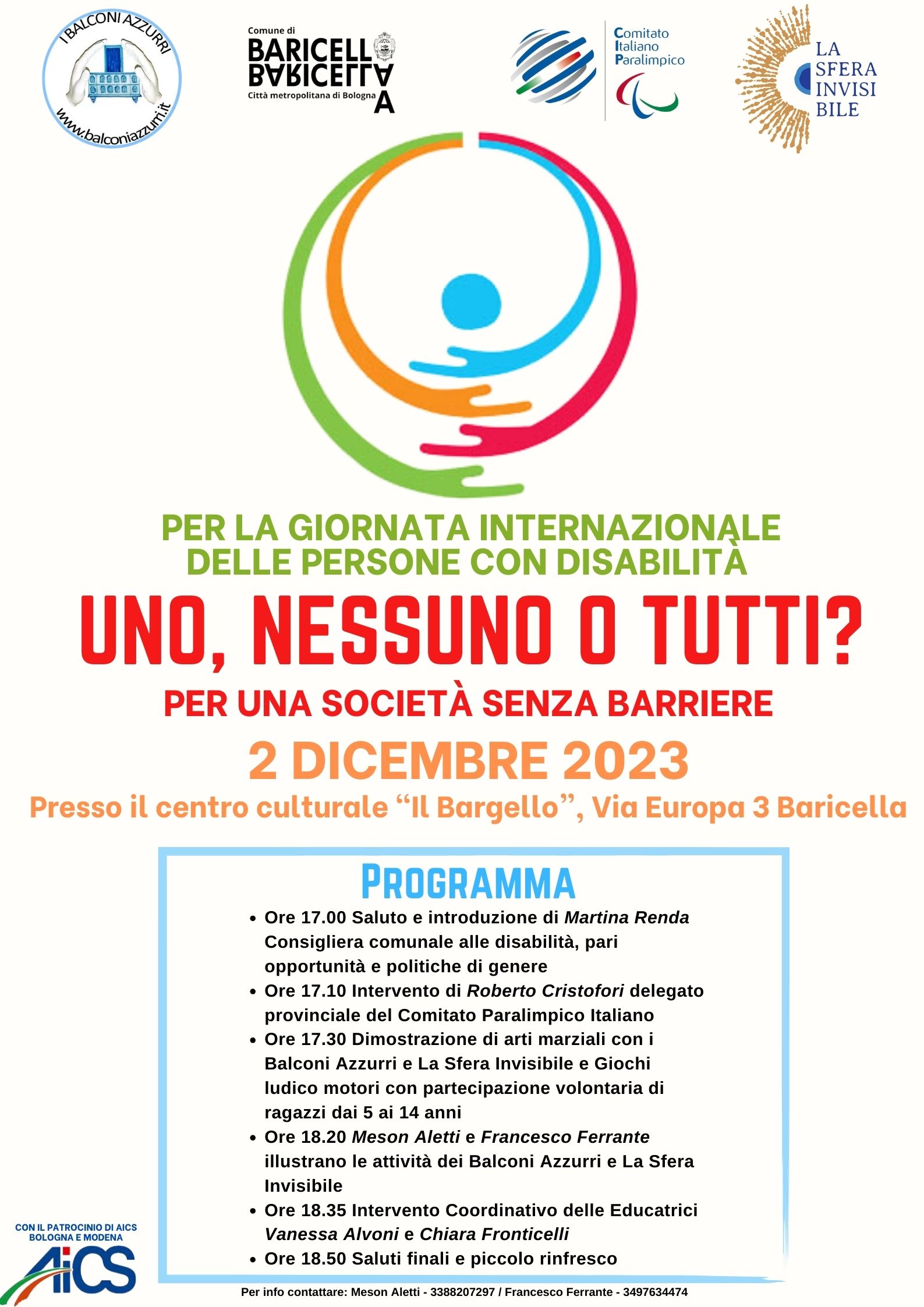 Per l'occasione, Sabato 2 Dicembre il Comune di Baricella, insieme alle associazioni del territorio La Sfera Invisibile, I Balconi Azzurri e del Comitato Paralimpico Italiano ha organizzato un evento informativo e interattivo con esibizioni di arti marziali e giochi ludico motori volto a sensibilizzare la cittadinanza sul valore della diversità.