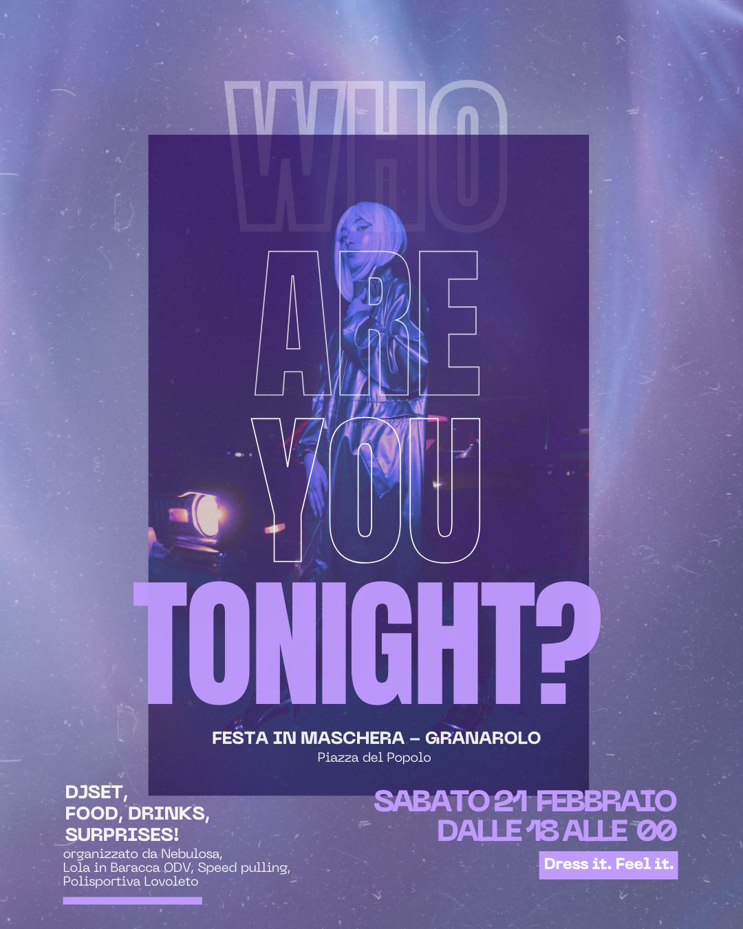 Dalle 18.00 alle 24.00, Piazza del Popolo ospiterà “WHO ARE YOU TONIGHT?”, una grande festa in maschera organizzata dai giovani del territorio con il supporto della Polisportiva Lovoleto.