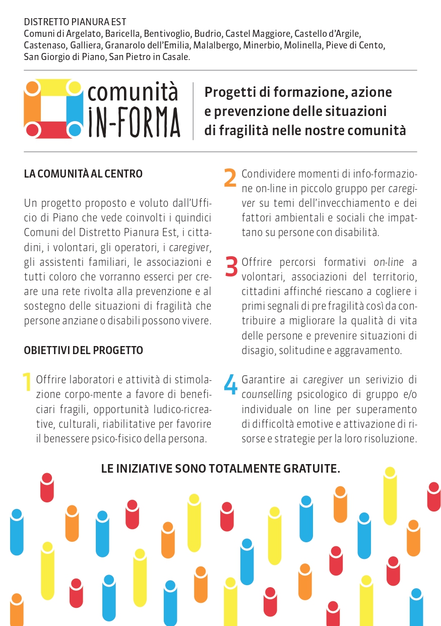 Comunità in forma è un progetto distrettuale che vede coinvolti i quindici Comuni del Distretto Pianura Est, cittadini, volontari, operatori, caregiver, assistenti familiari, associazioni e tutti coloro che vorranno esserci per creare una rete rivolta alla prevenzione e al sostegno delle situazioni di fragilità che persone anziane o disabili possono vivere.