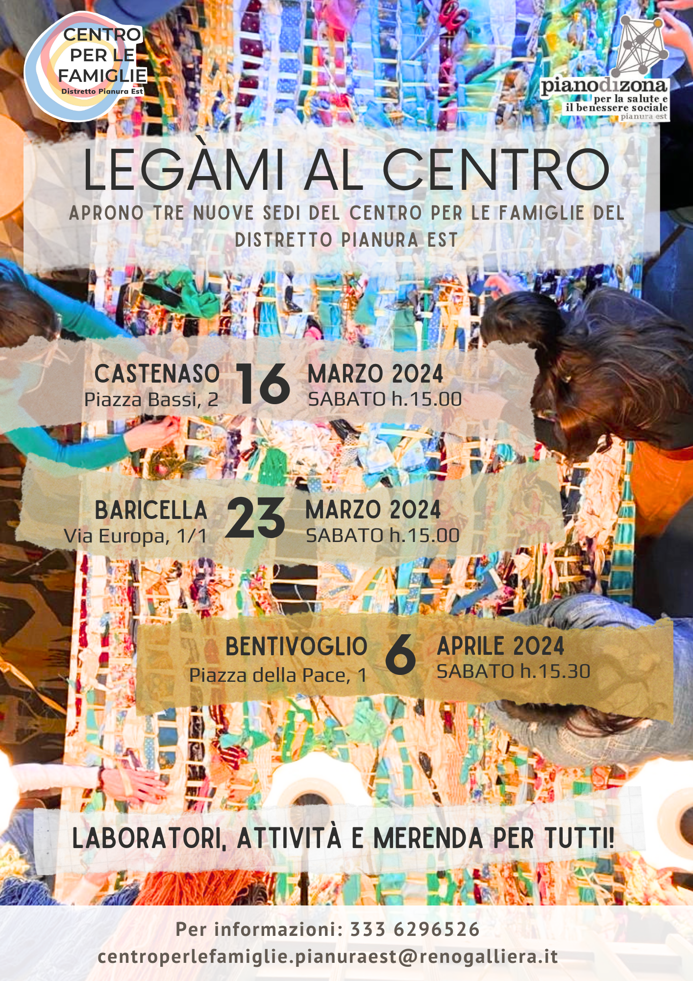 A tre anni dall'apertura, il Centro per le Famiglie ha nuove case! A partire dal 16 marzo, inaugurano i nuovi spazi di 3 delle sue sedi: quella principale di Bentivoglio (6/04), e le due distaccate di Baricella (23/03) e Castenaso (16/03). Le...