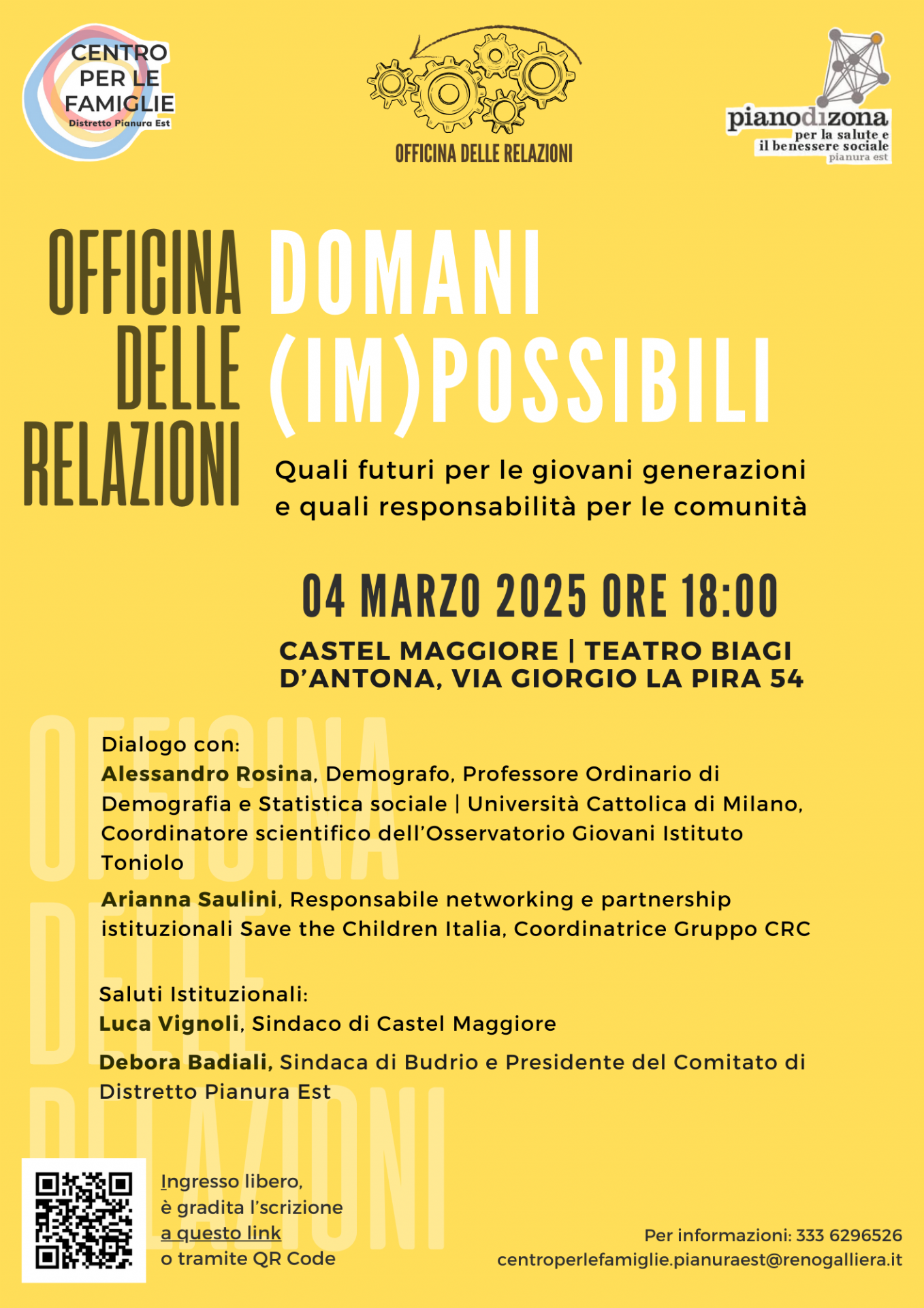Siamo lieti di invitarvi all'incontro "DOMANI I(IM)POSSIBILI, quali futuri per le giovani generazioni, quali responsabilità per le comunità" che si terrà il prossimo: