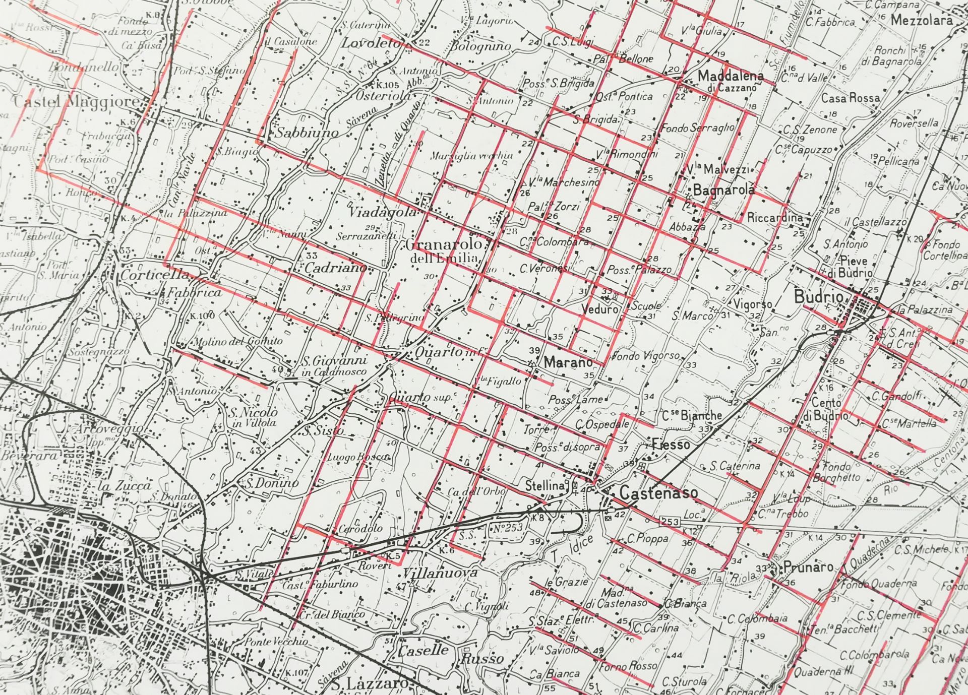 Per quanto riguarda la viabilità, si utilizzavano le strade della centuriazione soprattutto per gli spostamenti locali, mentre per quelli regionali, oltre alle grandi vie consolari, si utilizzarono lunghi rettifili che attraversavano in maniera obliqua le maglie centuriali collegando direttamente due località nel minor tempo possibile. Quarto Inferiore, ad esempio, era raggiunto dalla via obliqua che partiva da Bononia, ora ricalcata da via Zamboni, entro le mura, e da via san Donato in area extraurbana(Fig.2). E in effetti la distanza di quattro miglia romane tra le due località parrebbe ricordata dal nome stesso della frazione di Granarolo. Altri toponimi derivati dalla suddivisione centuriale romana sono, ad esempio, Cadriano dal nome del proprietario del fondo Catureius/Caturius, o Lovoleto da lupus.