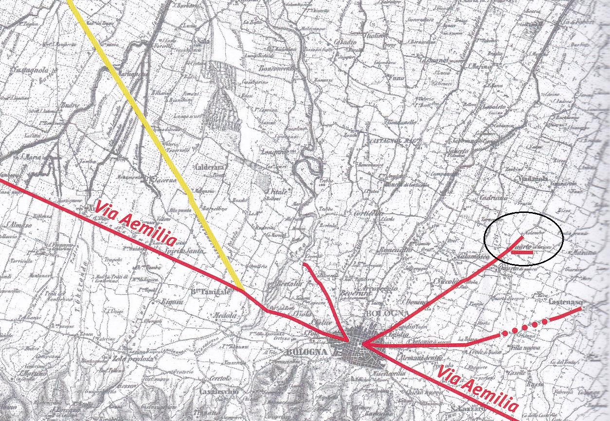 fig. 2 La via obliqua che collega Bononia con Quarto Inferiore indicata con l’ellisse nera; da P. Dall’Aglio, La linea e la rete. La viabilità storica dell’Emilia Romagna, Milano 2006.