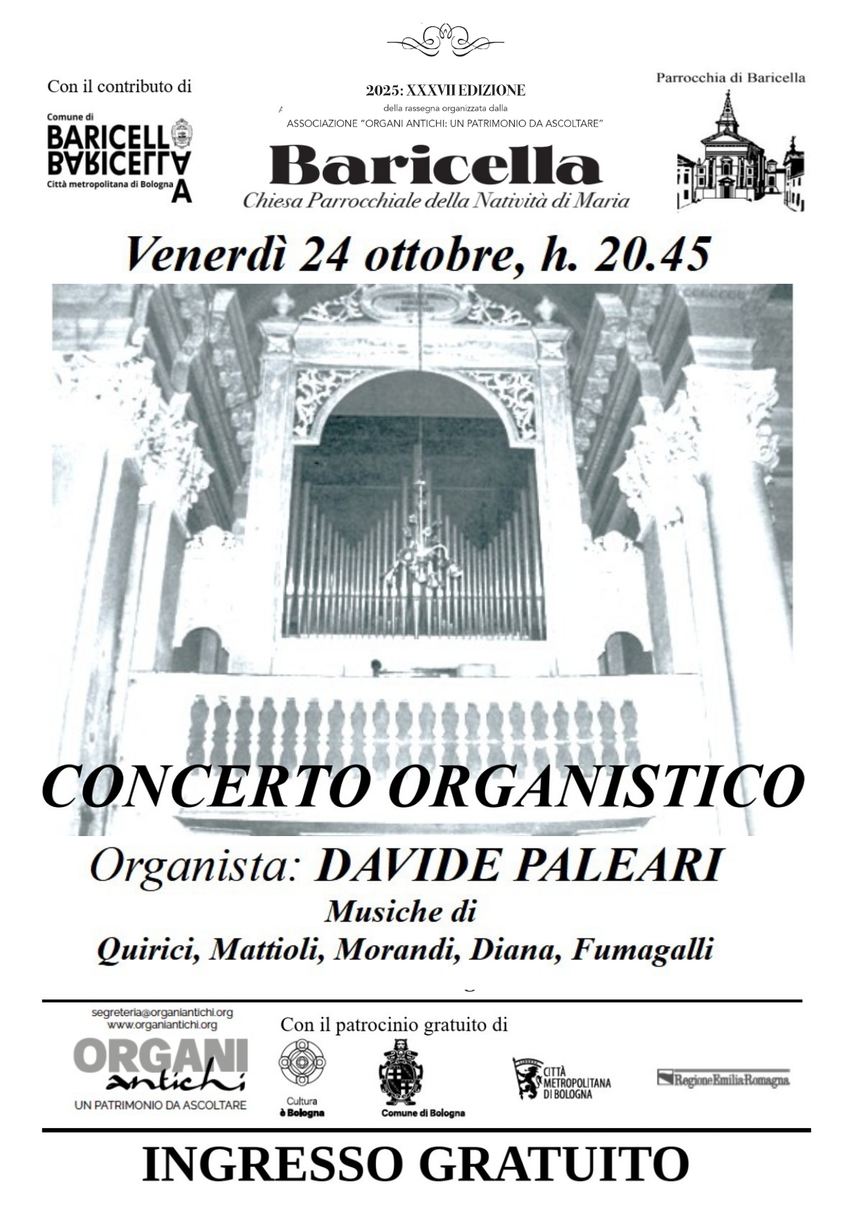 Il viaggio musicale della XXXVII edizione prosegue a Baricella, dove sorge uno strumento maestoso e affascinante, costruito nel 1874 da uno dei nomi più illustri dell’organaria ottocentesca italiana: Adeodato Bossi Urbani, originario di Bergamo. L’organo, imponente nella sua cassa decorata, è accompagnato da un dettaglio curioso e significativo: un cartiglio in cui si legge che è “proprietà dei possidenti e della comunità di Baricella”, a testimonianza di un forte legame tra lo strumento e la collettività che lo ha voluto e custodito.