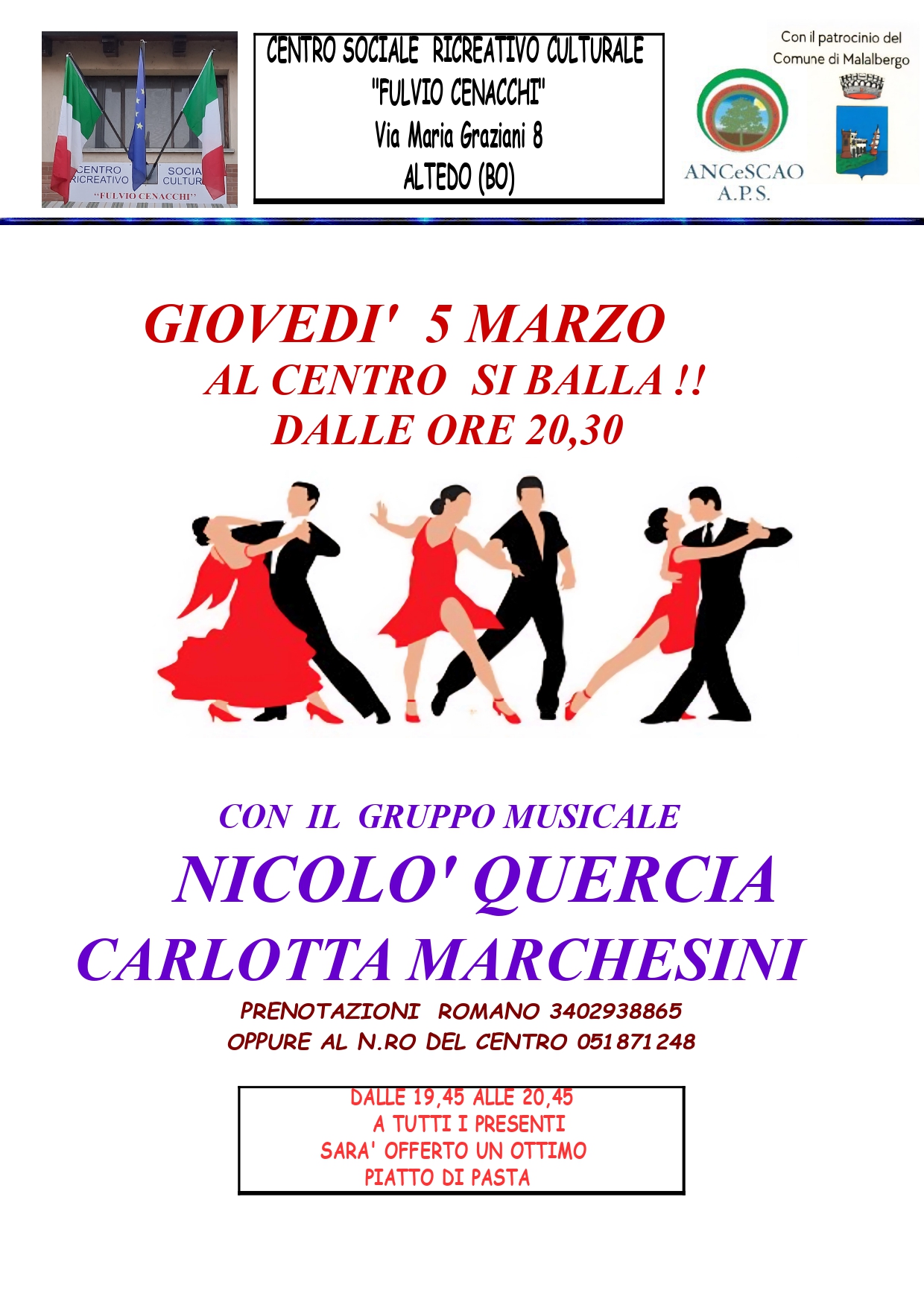 Per prenotazioni 051/871248 oppure Romano 340/2938865.