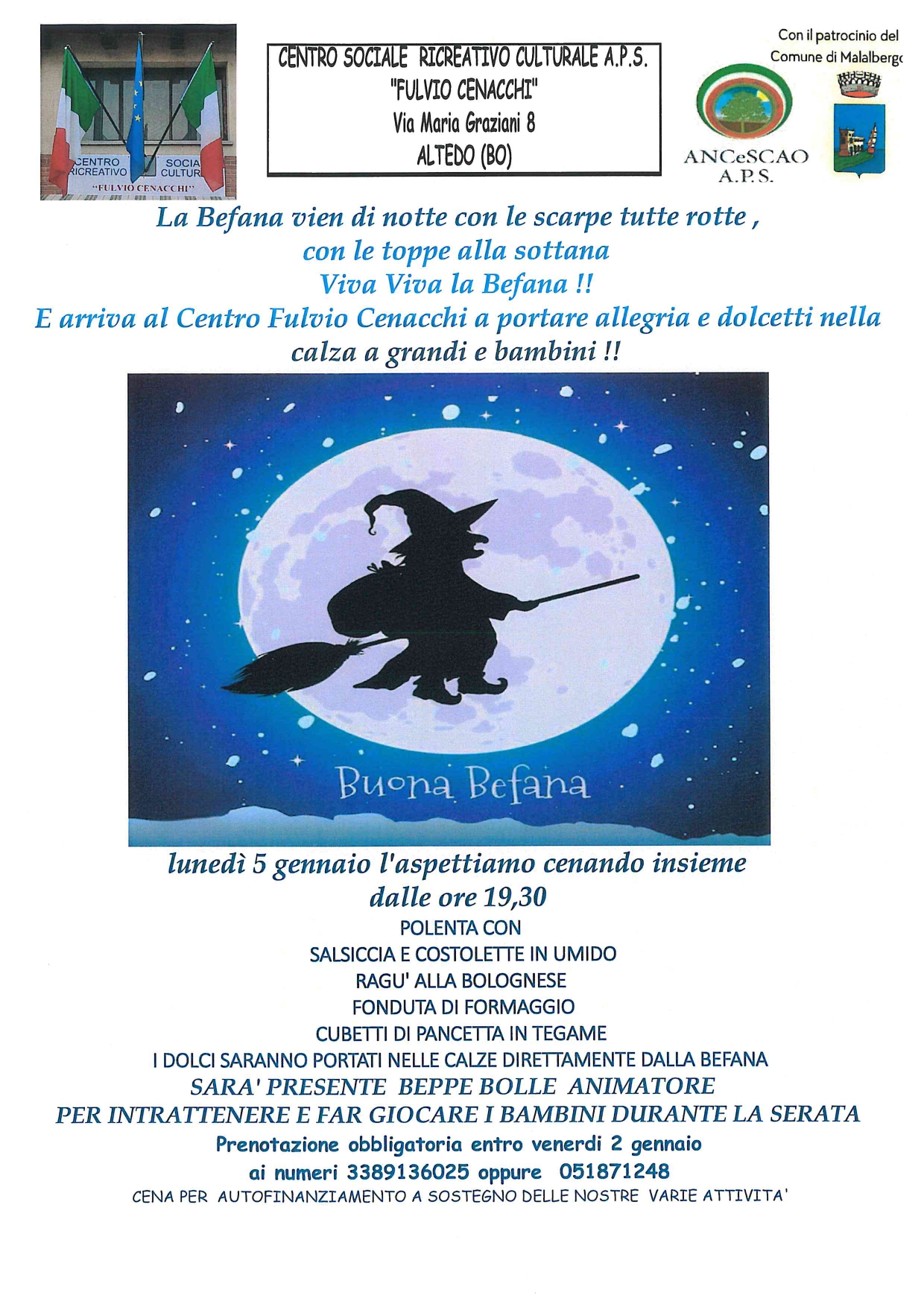 Aspettiamo insieme la Befana......quella vera! Arriverà al Centro "Fulvio Cenacchi" LUNEDI 5 GENNAIO preceduta da una ottima polentata. Ci sarà un animatore per i bambini ed arriverà proprio LEI la Befana che porterà la calza a grandi e piccini.