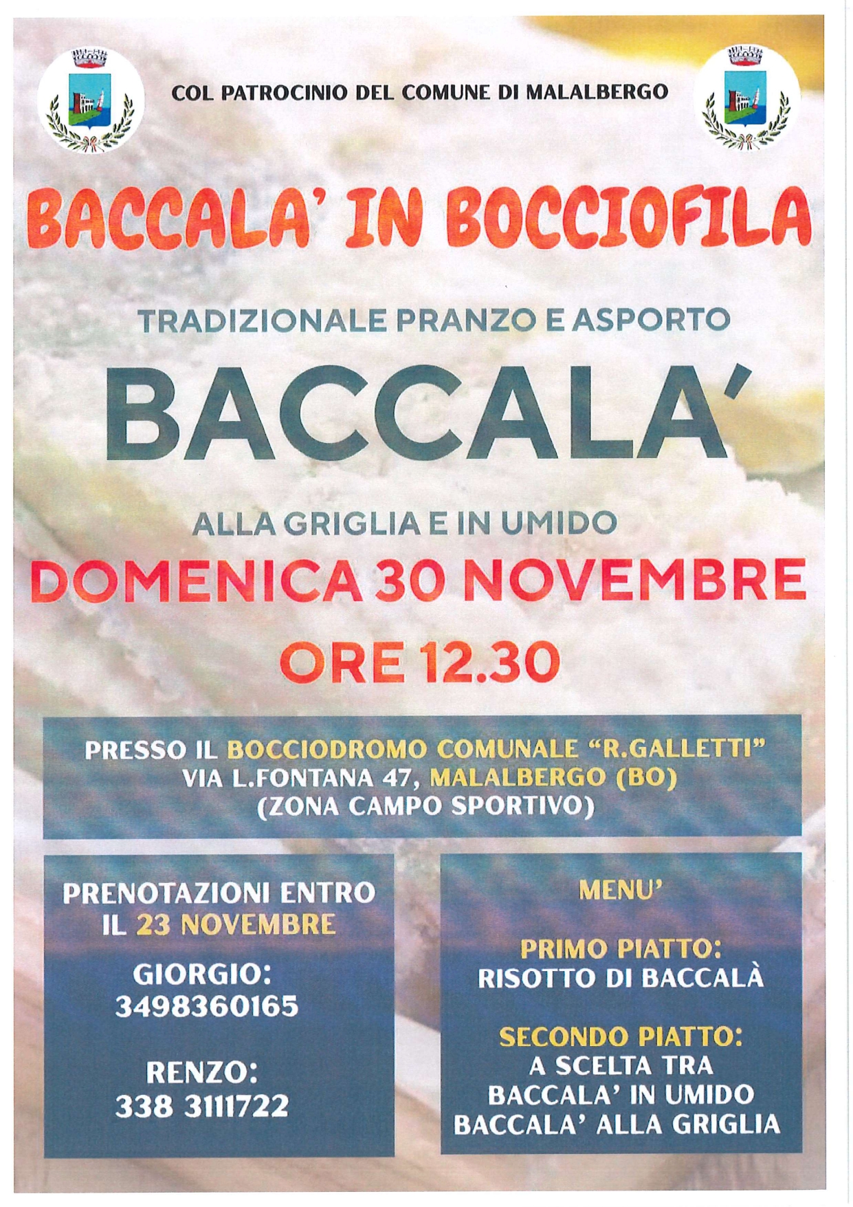 Tradizionale pranzo e asporto di Baccalà alla griglia e in umido presso il Bocciodromo Comunale "R.Galletti", Via L.Fontana 47 a Malalbergo