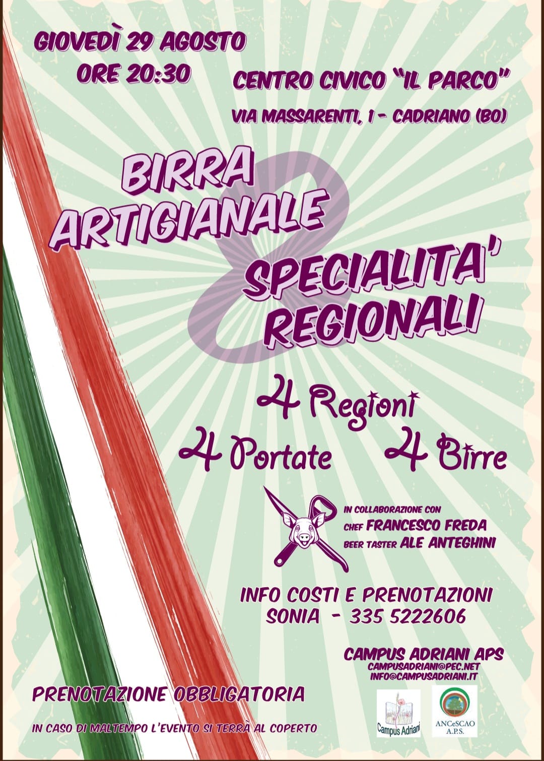 Cadriano si prepara a un’estate e un autunno ricchi di eventi enogastronomici organizzati da Campus Adriani. La prima serata, di degustazione, si terrà al Centro Civico di Cadriano (via Massarenti, 1) e offrirà ai partecipanti l’opportunità di esplorare le tradizioni culinarie regionali abbinate a birre artigianali.