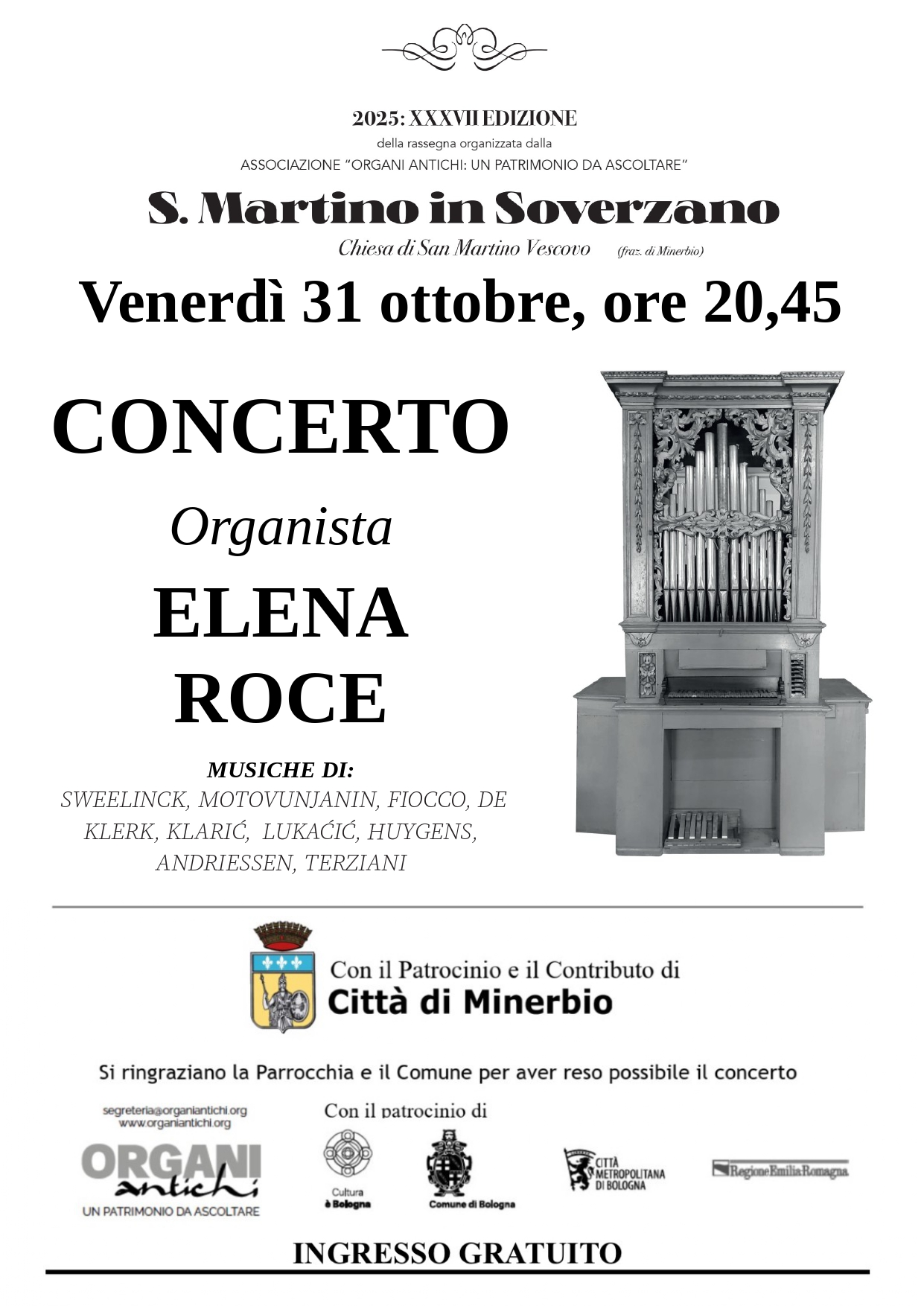 Venerdì 31 Ottobre 2025, alle ore 20:45 presso la Chiesa di San Martino Vescovo, di San Martino in Soverzano di Minerbio si terrà il concerto dell'organista Elena Roce, che riproporrà i brani di artisti quali Sweelinck, Motovunjanin, Fiocco, De Klerk, Klarić, Lukačić, Huygens, Andriessen e Terziani.
