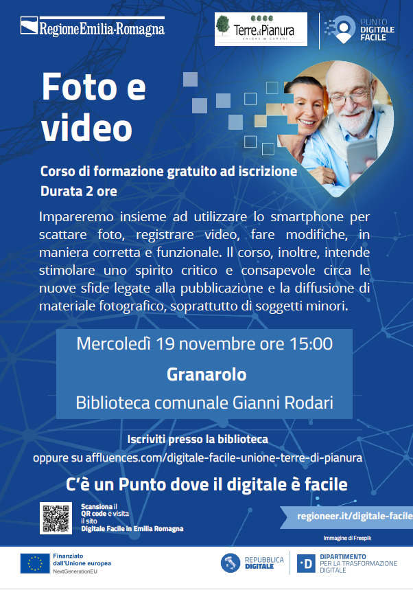 Mercoledì 19 novembre, alle ore 15:00, la Biblioteca comunale “Gianni Rodari” di Granarolo dell’Emilia ospita un nuovo appuntamento del progetto “Digitale Facile in Emilia-Romagna”: il corso gratuito “Foto e video con lo smartphone”.