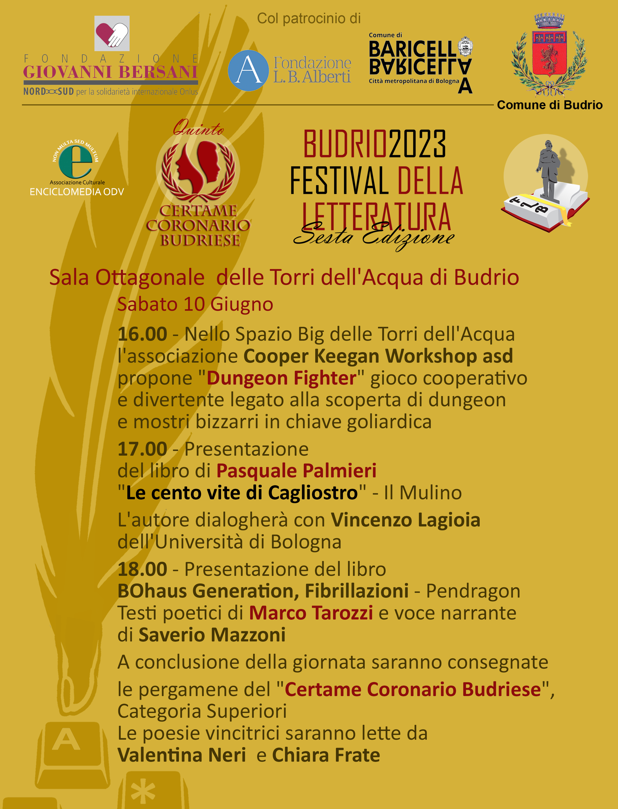 Torna il 9, 10 e l'11 Giugno il Festival della Letteratura di Budrio, con tre giorni all'insegna della cultura tra presentazioni di libri, dialoghi con gli autori e workshop. La manifestazione si concluderà con le premiazioni del Certame Coronario Budriese che quest'anno aveva come tema "il gioco".
