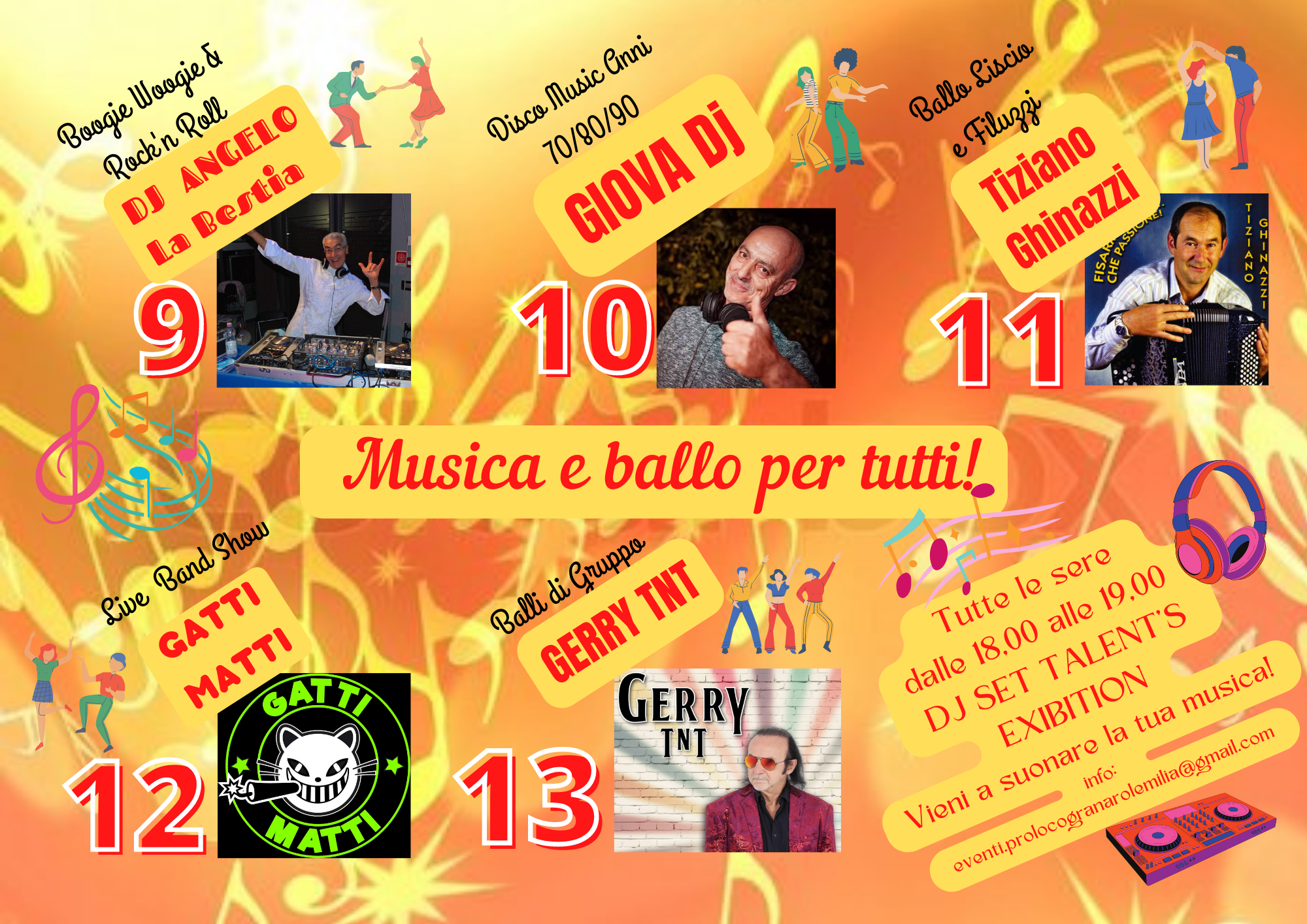 Nell'area adiacente al Municipio, tutte le sere aperitivo dalle 18 alle 20; stand gastronomico dalle 19 alle 22 e dalle 21 uno spettacolo musicale diverso per ogni serata.
