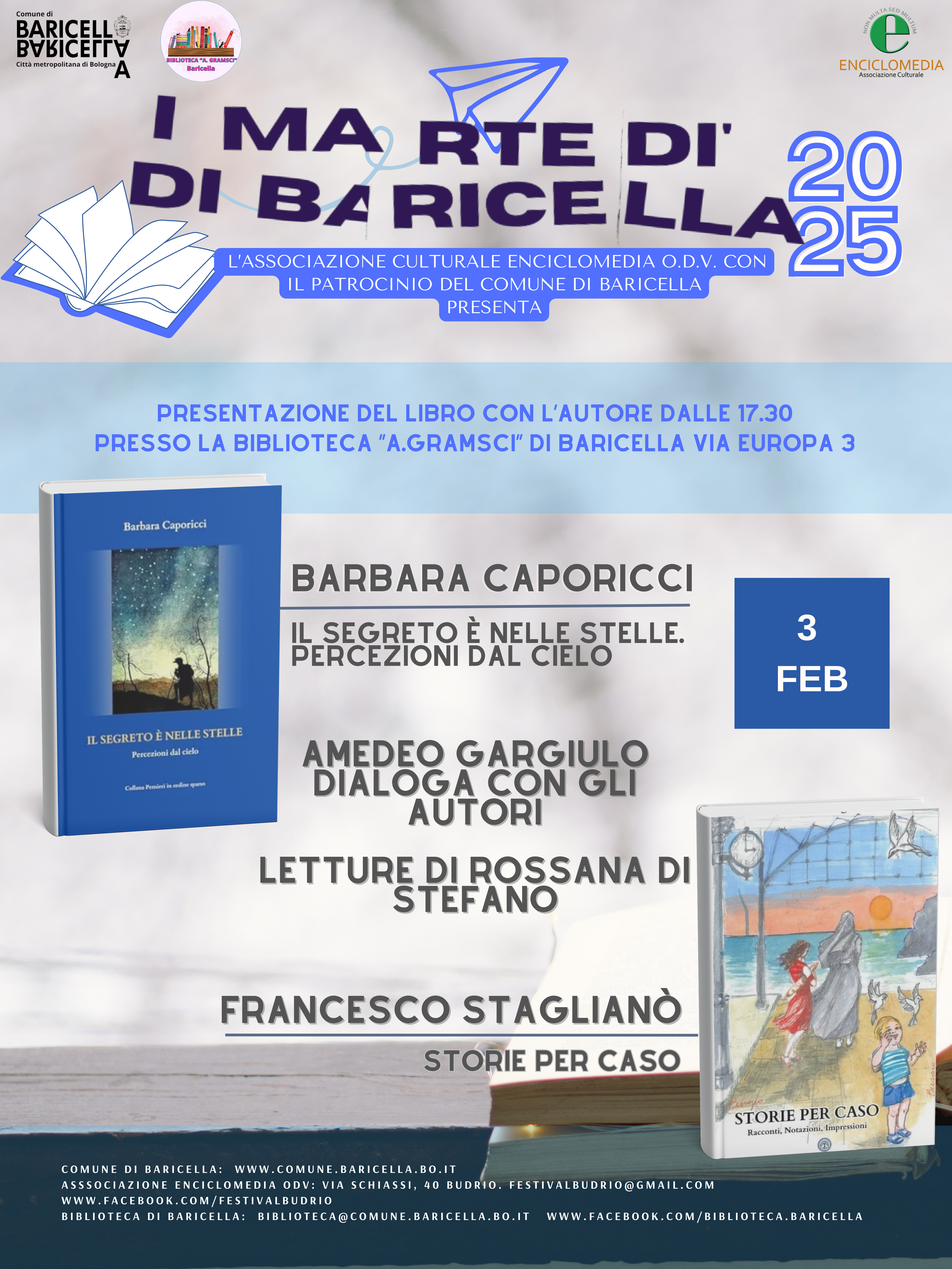 L’iniziativa, promossa e curata dall’Associazione Culturale Enciclomedia ODV con il patrocinio del Comune di Baricella, prosegue il percorso avviato nel 2020 di valorizzazione e diffusione della cultura sul territorio.