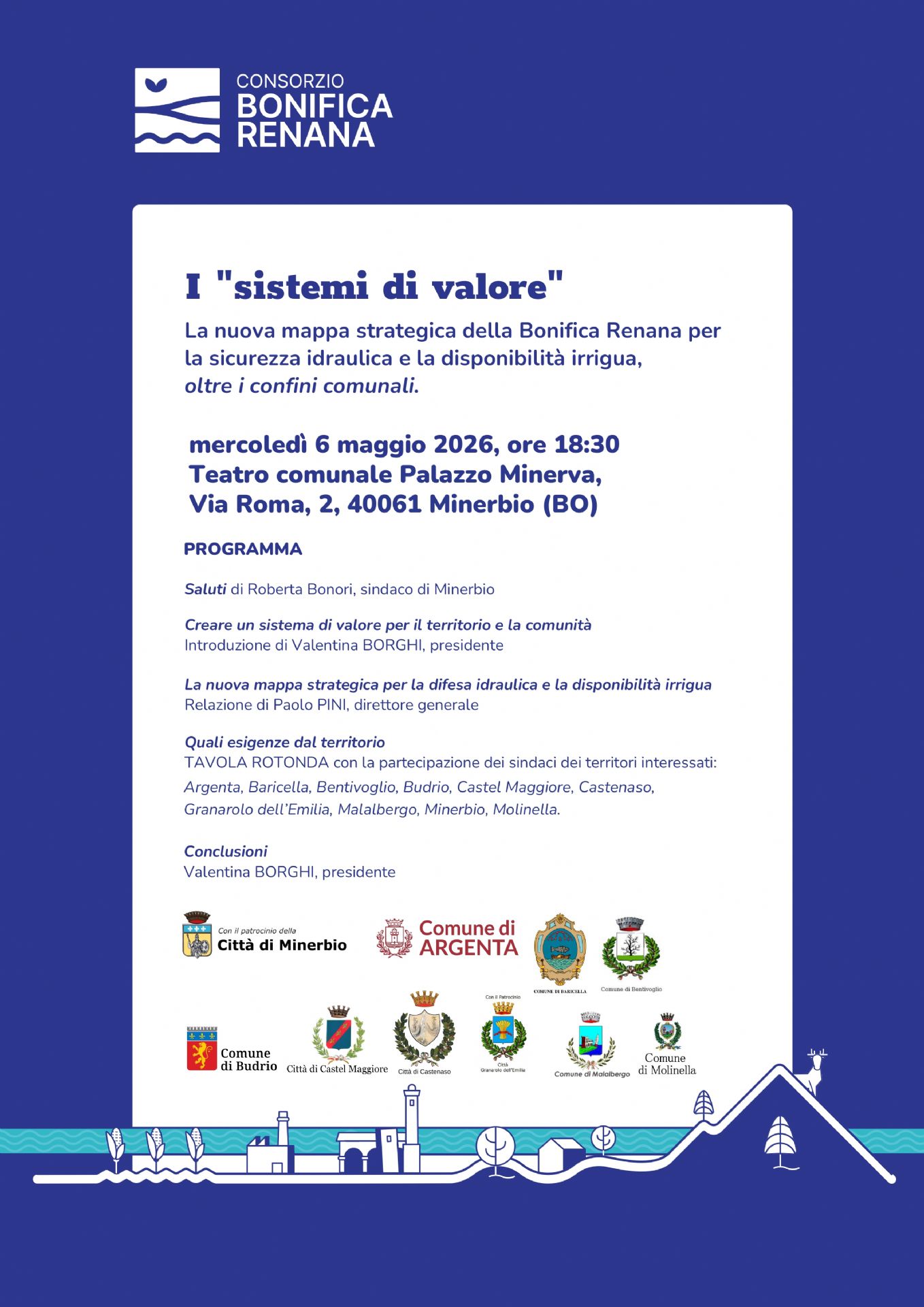 Il Consorzio di Bonifica Renana invita la cittadinanza all'evento pubblico dedicato alla presentazione della nuova mappa strategica per la sicurezza idraulica e la disponibilità irrigua oltre i confini comunali. L'evento si terrà Mercoledì 6 maggio 2026 alle ore 18:30 presso il Teatro Comunale Palazzo Minerva — Via Roma, 2 — 40061 Minerbio (BO).