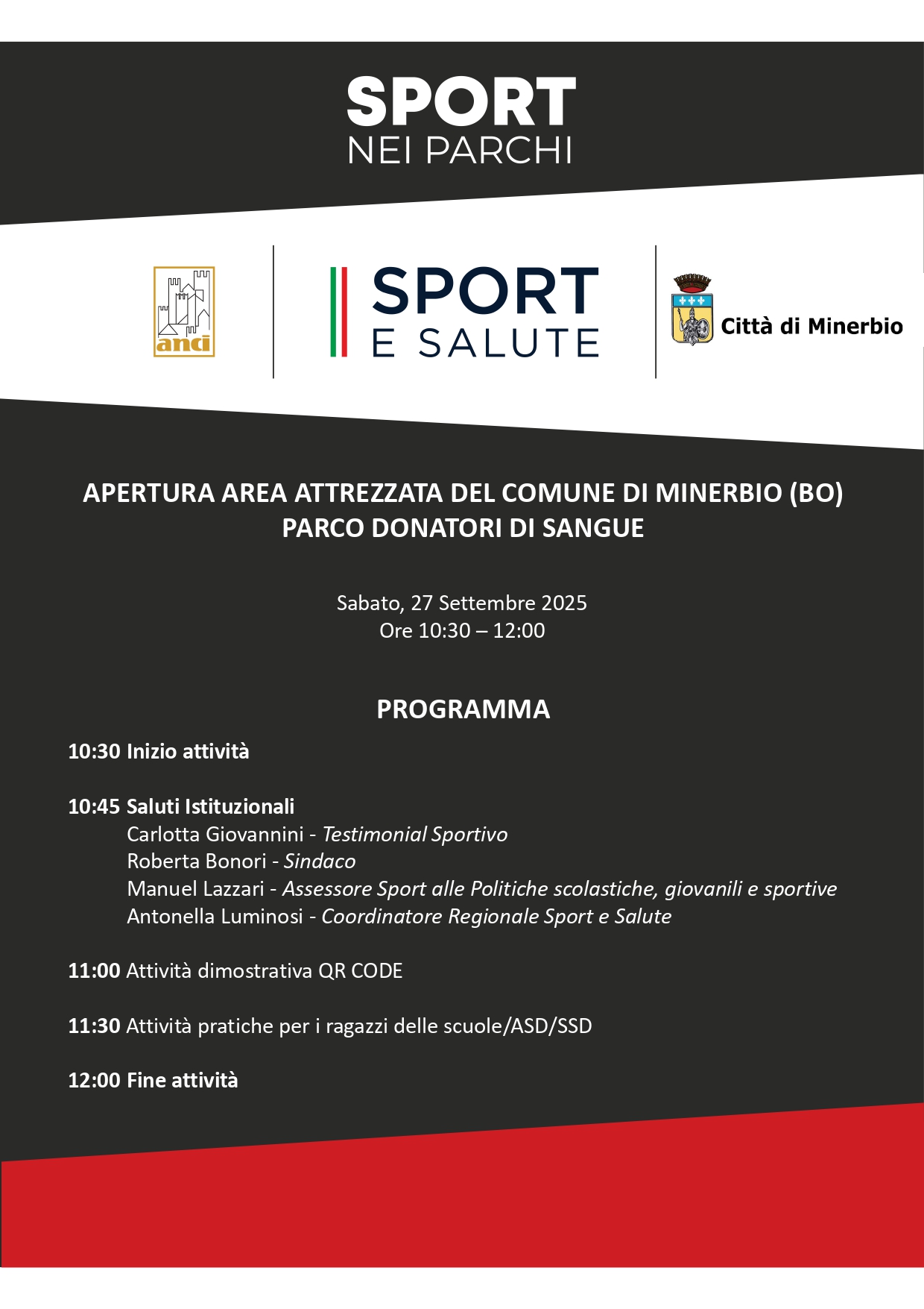 Al taglio del nastro saranno presenti il Sindaco Roberta Bonori, l’Assessore alle Politiche Scolastiche, giovanili e sportive Manuel Lazzari, la ginnasta Carlotta Giovannini, medaglia d'oro al volteggio ai Campionati Europei del 2007. A seguire, ci saranno le attività pratiche e dimostrative con i ragazzi di alcune delle associazioni sportive del territorio.