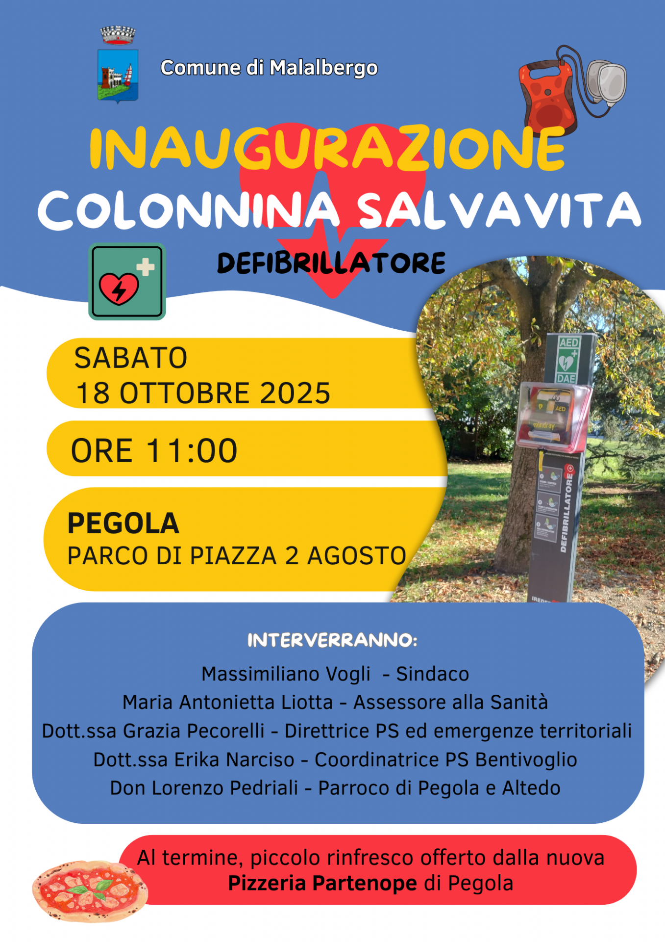 Sabato 18 Ottobre alle ore 11:00 presso il Parco di Piazza 2 Agosto ci sarà l’inaugurazione della colonnina salvavita (defibrillatore) con l’intervento di :