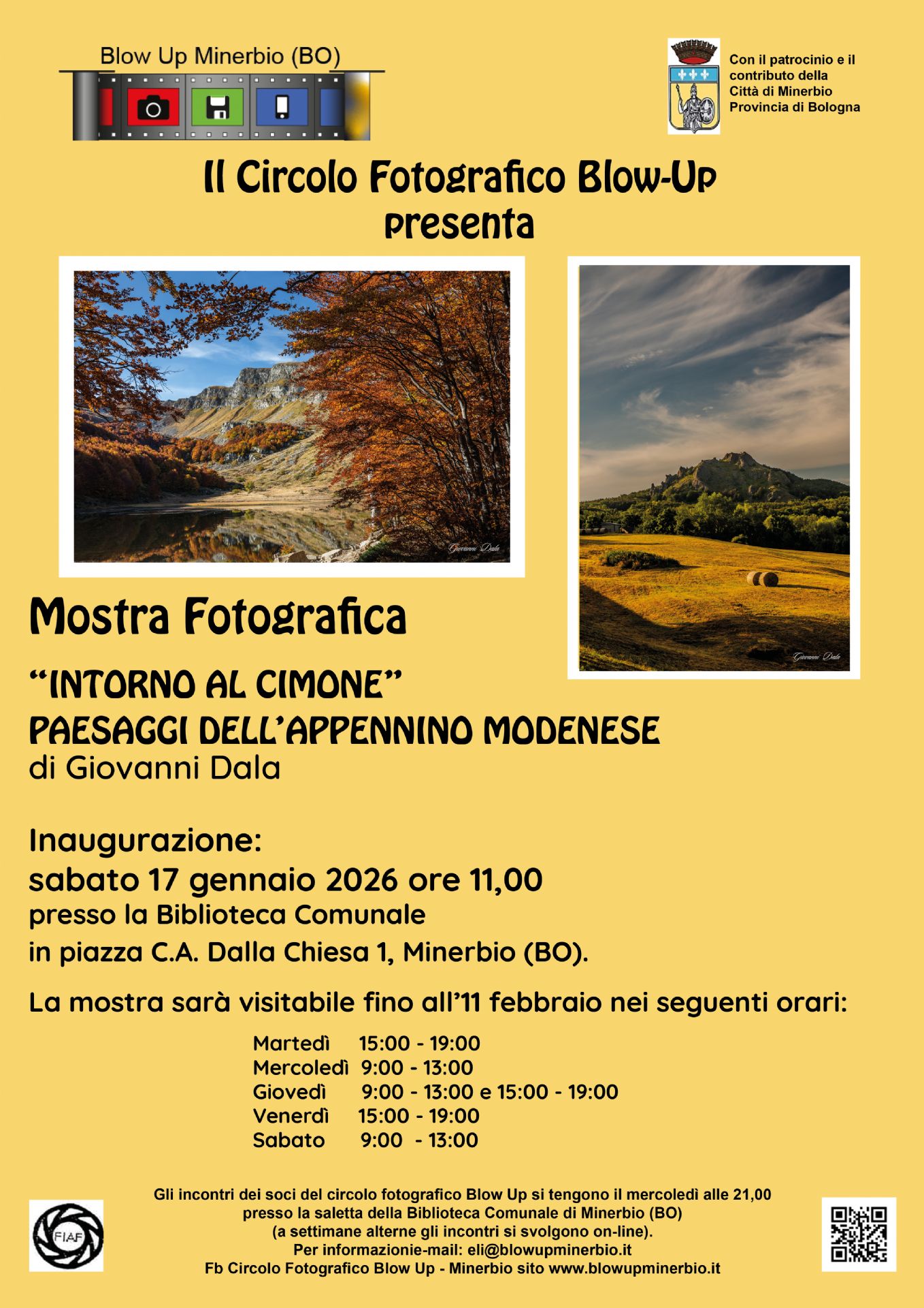 Sabato 17 gennaio 2026, alle ore 11, presso la Biblioteca Comunale in Piazza C.A. Dalla Chiesa n. 1, si terrà l’inaugurazione della mostra “Intorno al Cimone, paesaggi dell’Appennino Modenese”, a cura di Giovanni Dala.