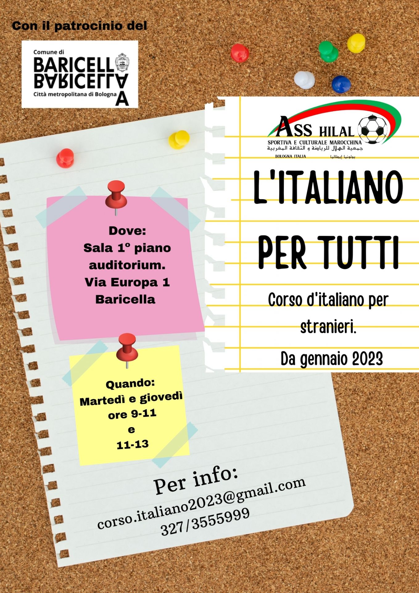 Partirà martedì prossimo 10 Gennaio 2023 il corso di italiano per stranieri a cura dell'Associazione Hilal Sportiva e Cultura Marocchina, patrocinato dal Comune di Baricella.