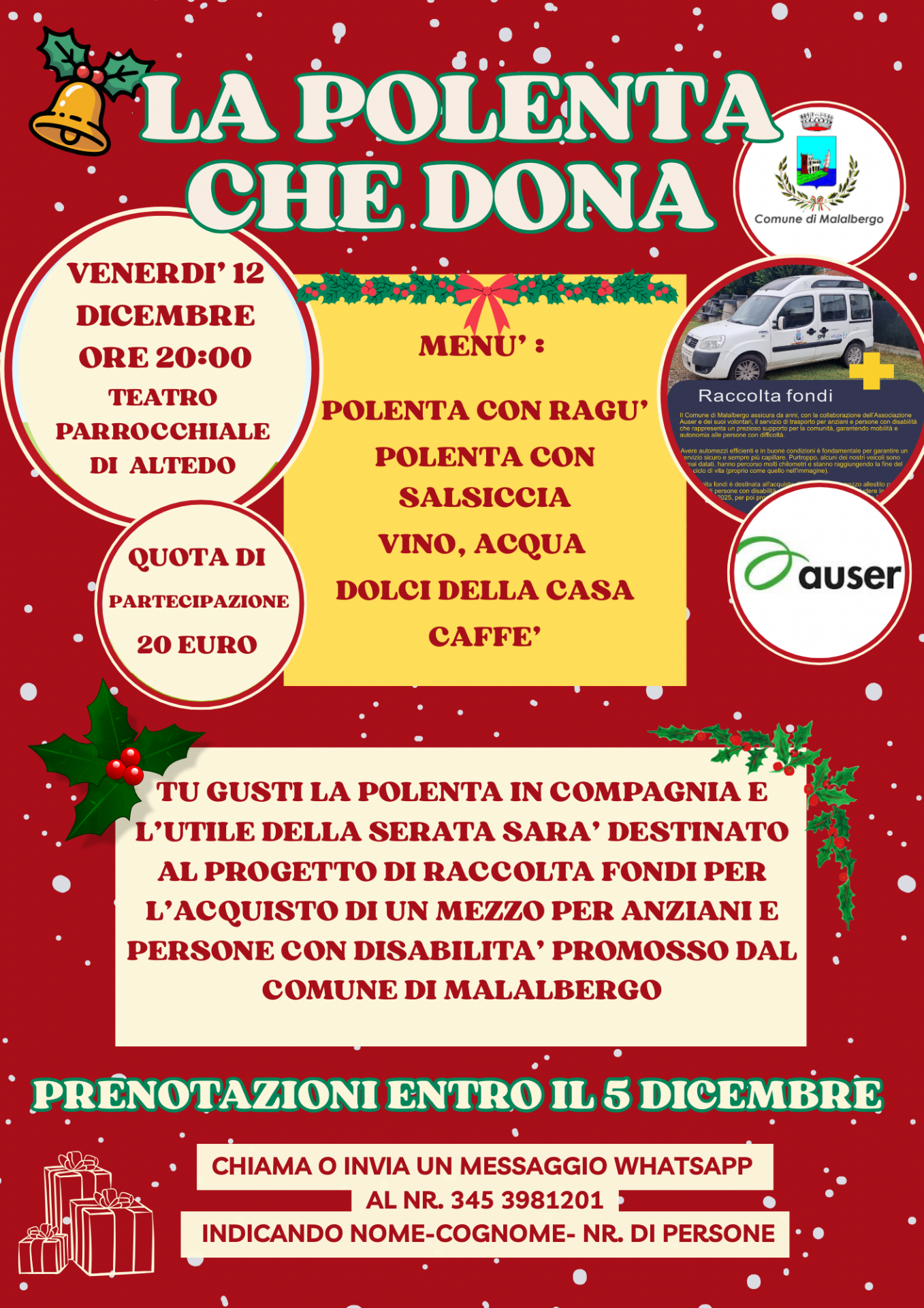 Tu gusti la polenta in compagnia e l'utile della serata sarà destinato al progetto di raccolta fondi per l'acquisto di un mezzo per anziani e persone con disabilità promosso dal Comune di Malalbergo.