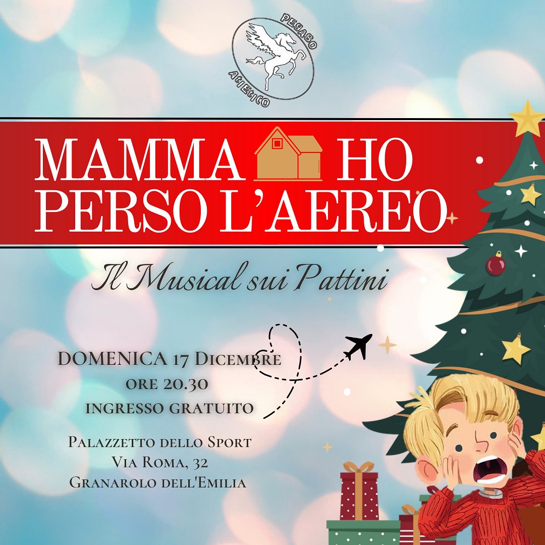 Alle 20.30 del 17 dicembre grande spettacolo al palazzetto dello sport di via Roma con il saggio di Natale di Atletico Pegaso Pattinaggio: quest’anno il musical sui pattini sarà “Mamma ho perso l’aereo!”.
