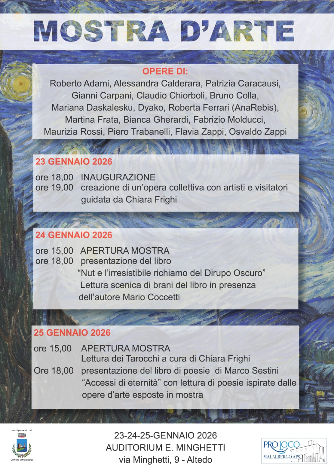 Mostra d'Arte con opere di : Roberto Adami, Alessandra Calderara, Patrizia Caracausi, Gianni Carpani, Claudio Chiorboli, Bruno Colla, Mariana Daskalesku, Dyako, Roberta Ferrari (AnaRebis), Martina Frata, Bianca Gherardi, Fabrizio Molducci,Maurizia Rossi,Piero Trabanelli, Flavia Zappi, Osvaldo Zappi.