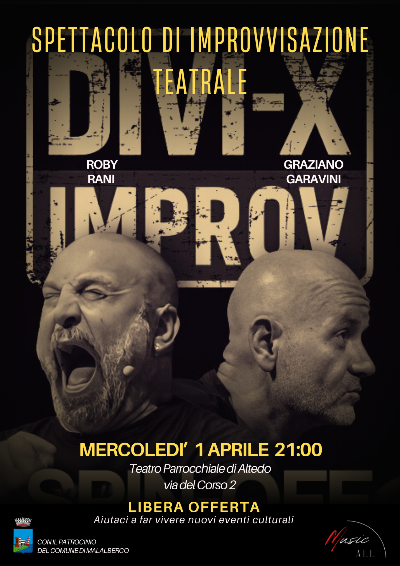 L'associazione Music All con il patrocinio del Comune di Malalbergo, per il terzo degli appuntamenti della sua Rassegna di Primavera ospita sul palco i DIVI-X, il duo formato da Roby Rani e Graziano “Gara” Garavini, improvvisatori con oltre 20 anni di esperienza sui palchi di tutta Italia.