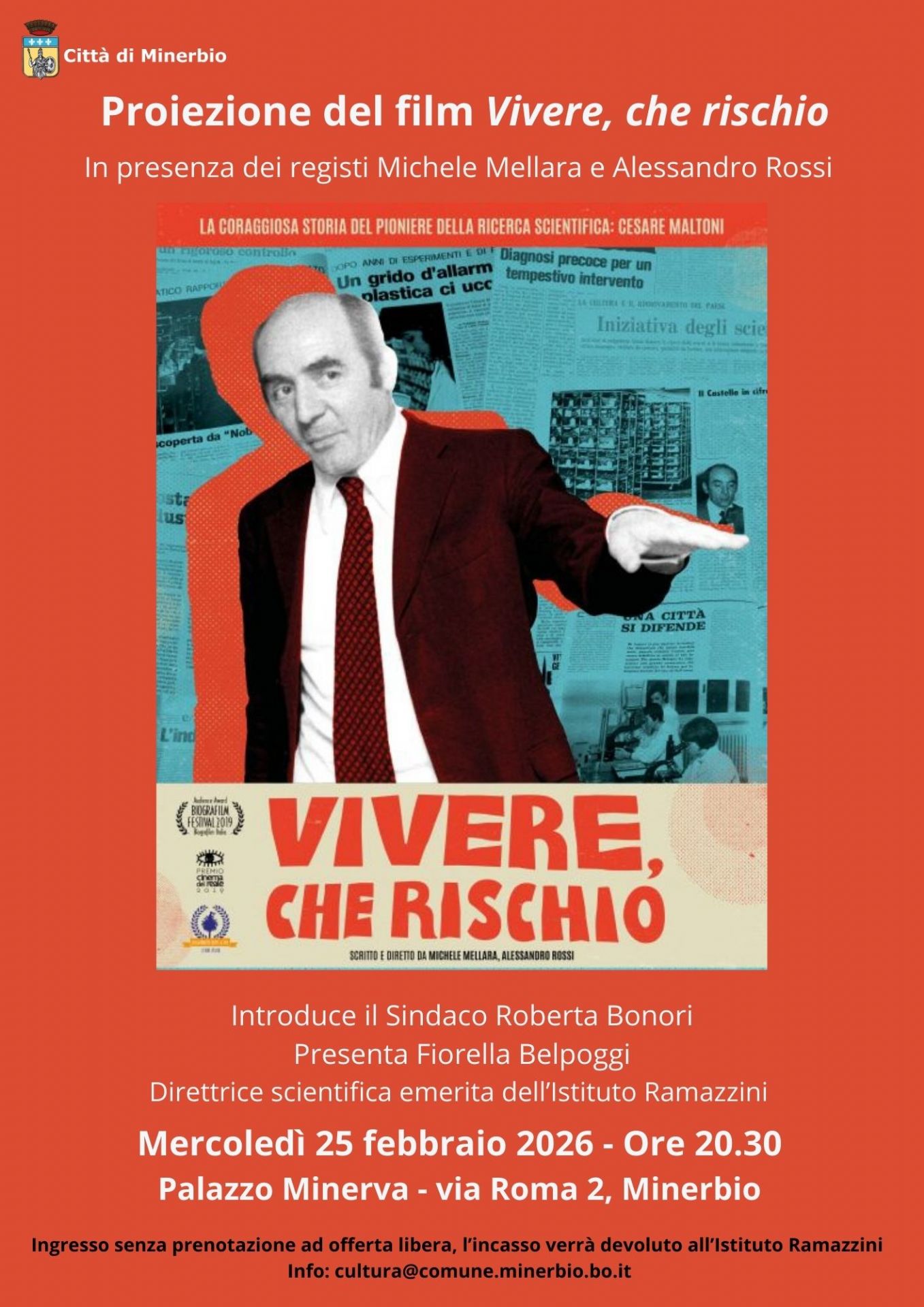"Vivere, che rischio - La coraggiosa storia del pioniere della ricerca scientifica: Cesare Maltoni" (Produzione Mammut Film, 2019), in presenza dei registi Michele Mellara e Alessandro Rossi.