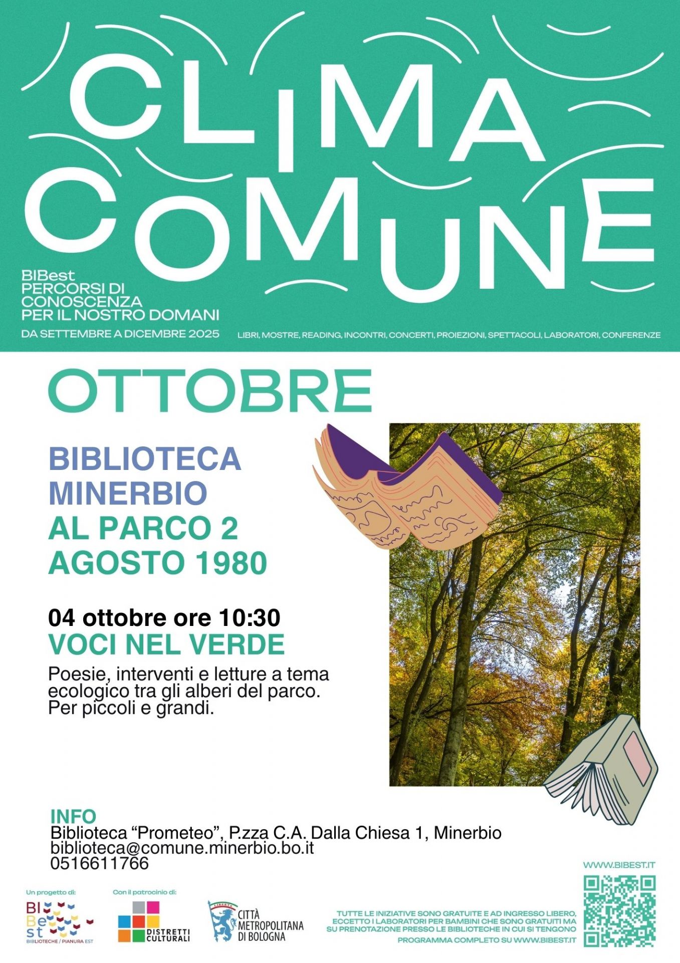 Sabato 4 ottobre alle ore 10:30, il Parco 2 Agosto 1980 ospiterà "Voci nel verde", un evento immersivo tra gli alberi dedicato alla poesia, alle letture e agli interventi a tema ecologico. Un’occasione per riflettere sull’ambiente attraverso le parole, pensata per coinvolgere sia i più piccoli che gli adulti.